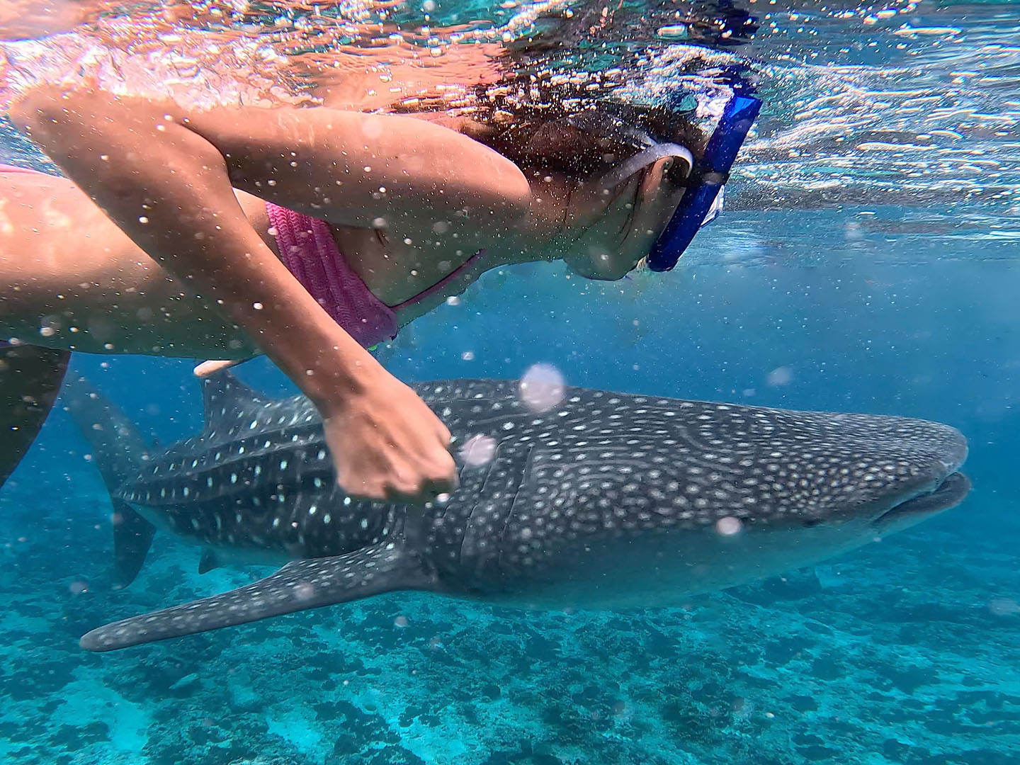 - Swim alongside whale sharks, never in front.